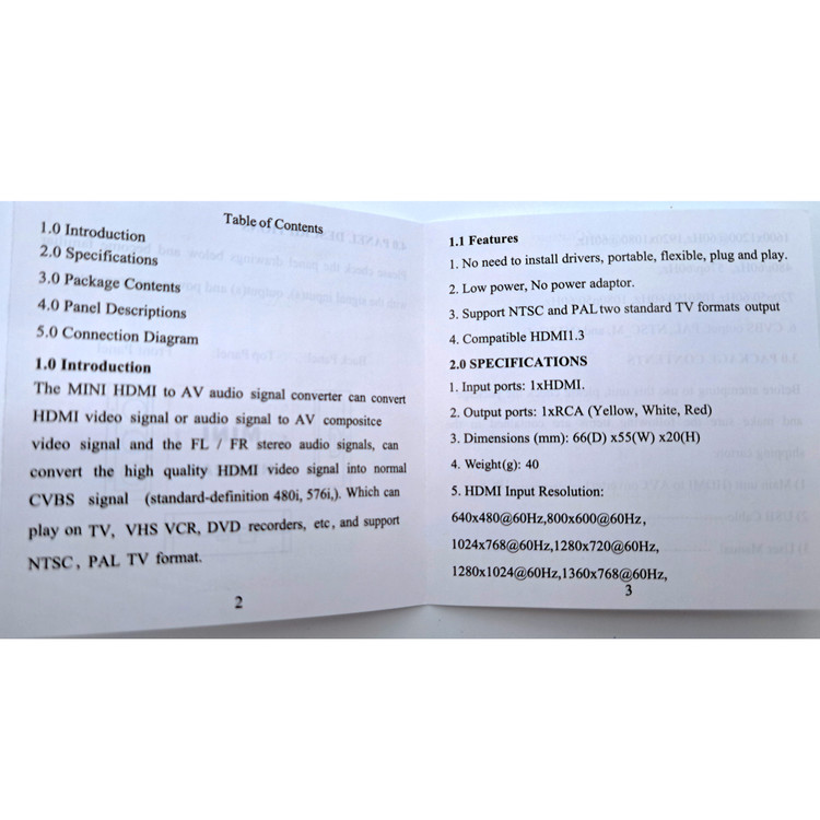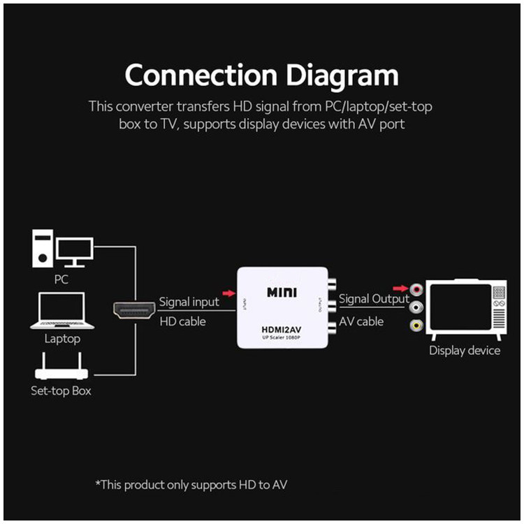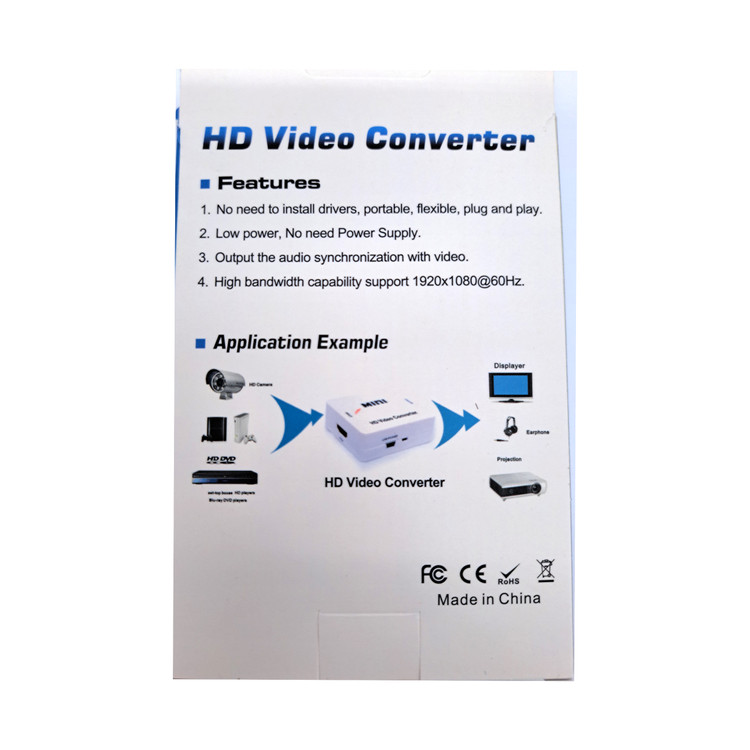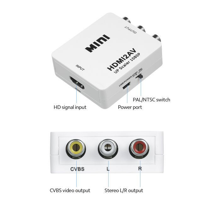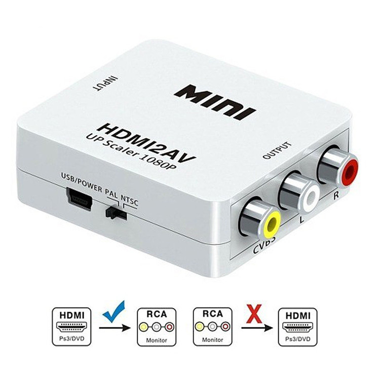 پشتیبانی از ورودی تصویر با رزولوشن های 1080-1080P-720P-4K- پشتیبانی از خروجی با بالاترین وضوح تامین برق از طریق کابل USB-ولتاز 5v جنس بدنه:پلاستیک فشرده ورودی :HDMI خروجی:AV-RCA