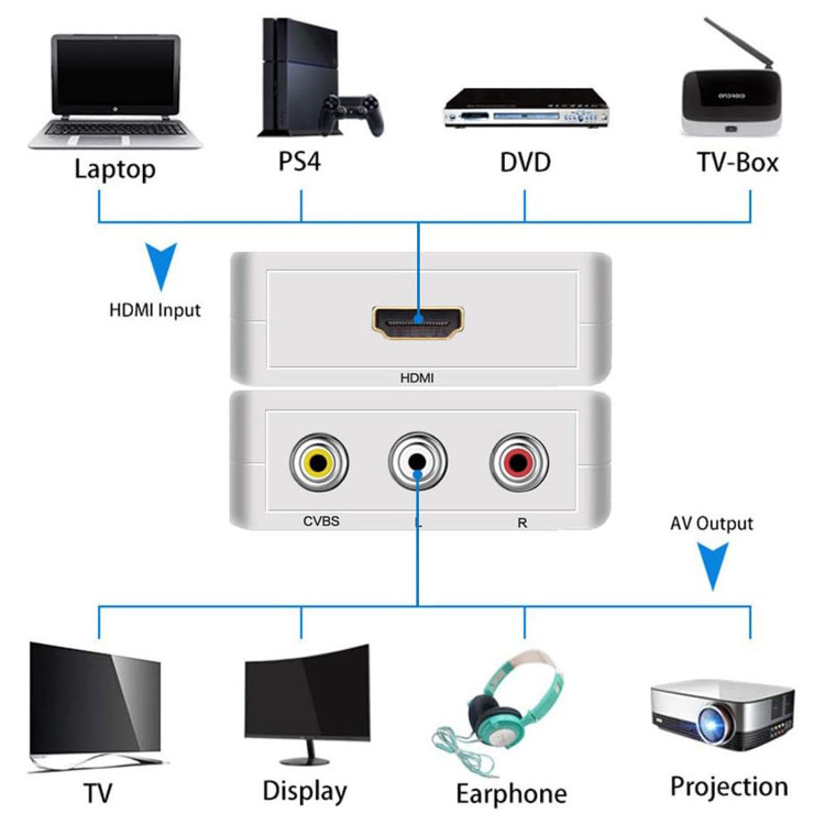 با استفاده از تبدیل HDMI به AV می توان دستگاههای با خروجی اچ دی ام آی مثل رسیور و سینمای خانگی ، کامپیوتر ، لپ تاپ و … را به دستگاههای دارای ورودی AV یا 3 فیش زرد و سفید و قرمز مثل تلویزیون معمولی قدیمی یا ویدیو پرژکتور متصل کرد. تبدیل HDMI به AV مدل MYGROUP-M3V بالاترین خروجی رزولوشن تصویر را دارد و برای دستگاه هایی مانند PS4 که دارای رزولوشن و کیفیت خروجی تصویر بالایی هستند به کار می رود .