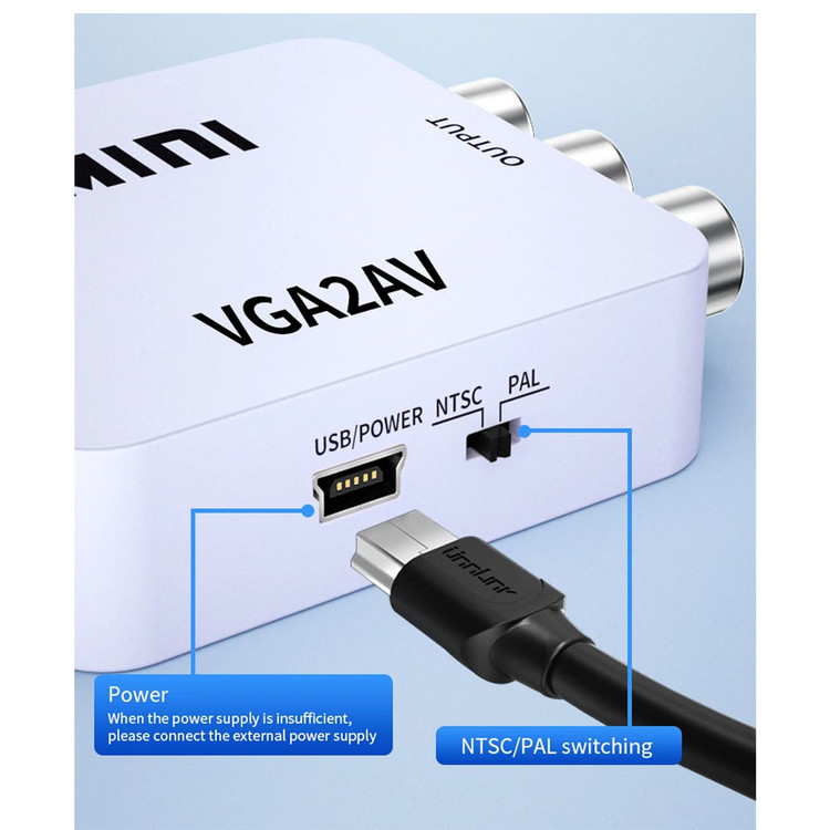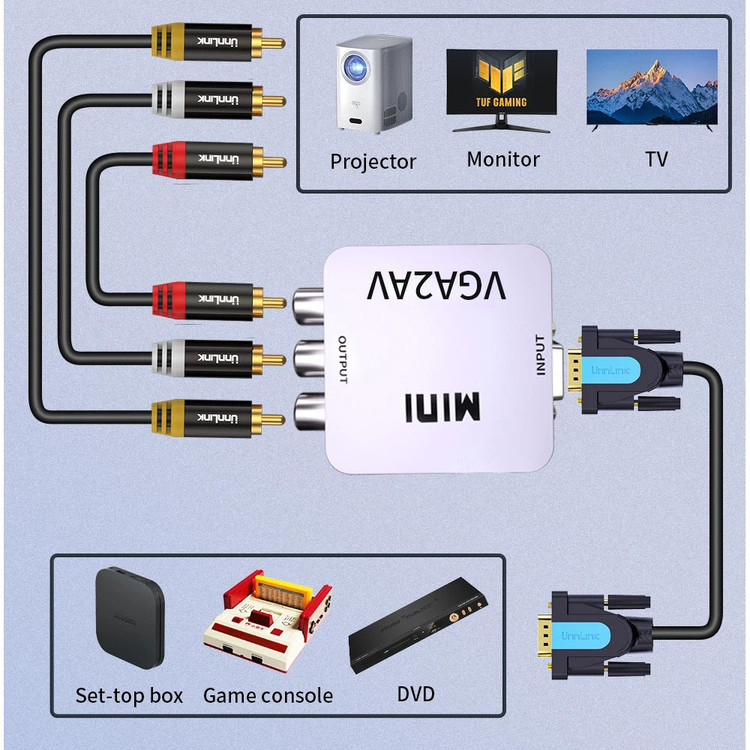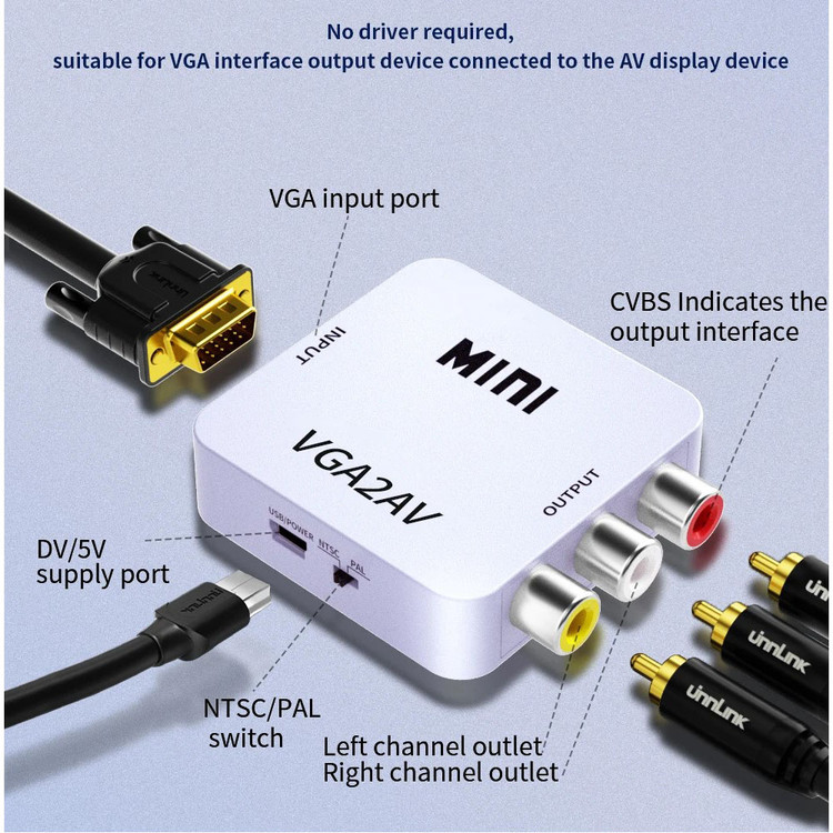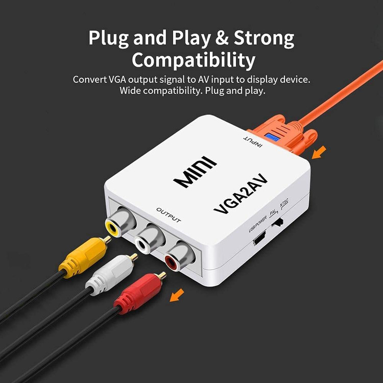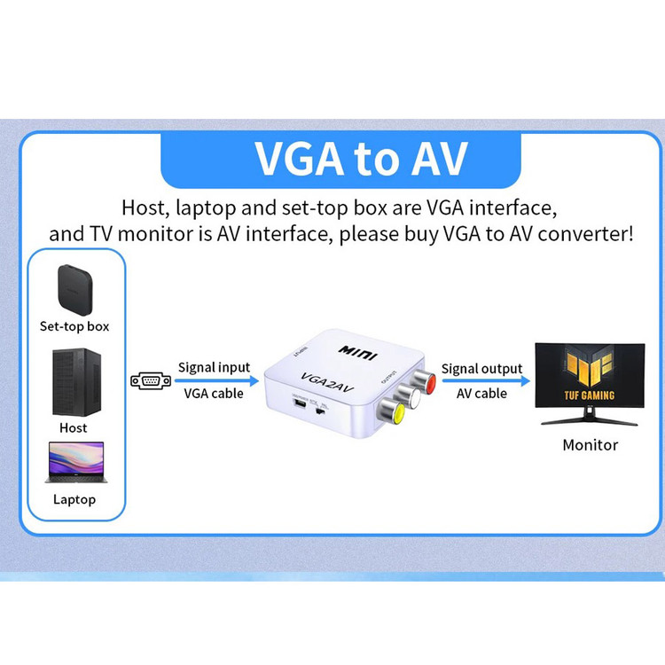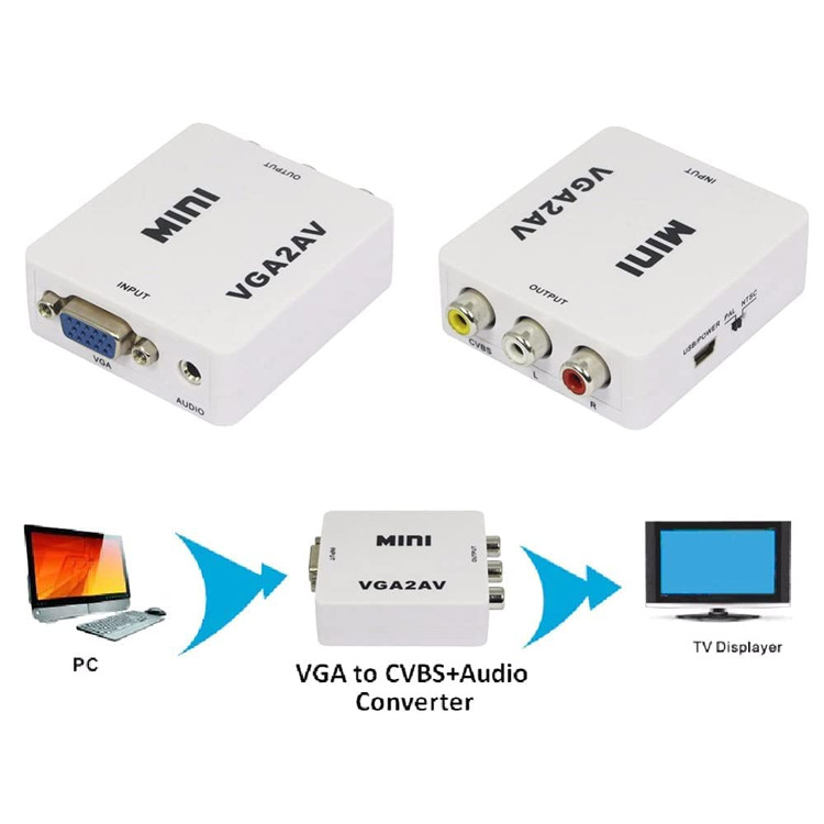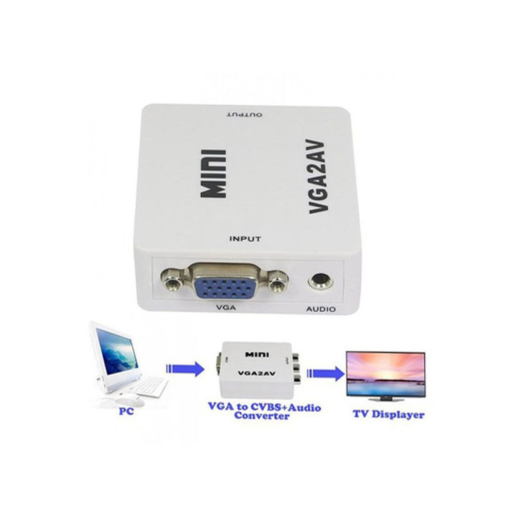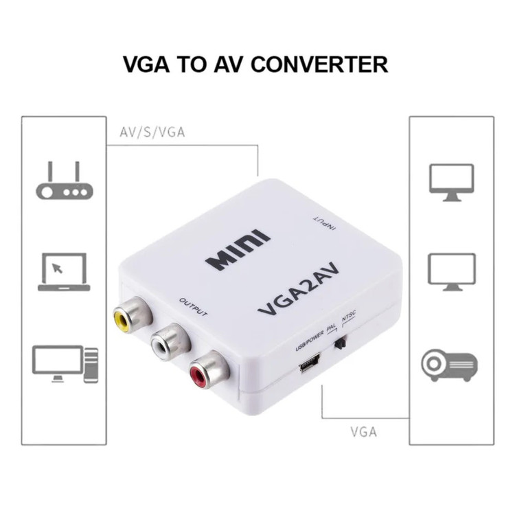 این مبدل دارای ورودی VGA و خروجی AV می باشد . در صورتی که دستگاه شما خروجی AV نداشته باشد ولی دستگاهی که قرار است به آن متصل شود دارای AV باشد از این مبدل استفاده میشود . فرض کنید میخواهید لپ تاپ شما قرار است به ویدیوپروژکتوری متصل شود که فقط دستگاه فقط ورودی پورت AVدارد . ولی لپ تاپ شما فقط خروجی VGA دارد . در این حالت خروجی لپ تاپ شما که VGA است به ورودی مبدل متصل شده ، سپس خروجی مبدل که AV است به کابل ویدیو پروژکتور متصل میگردد .