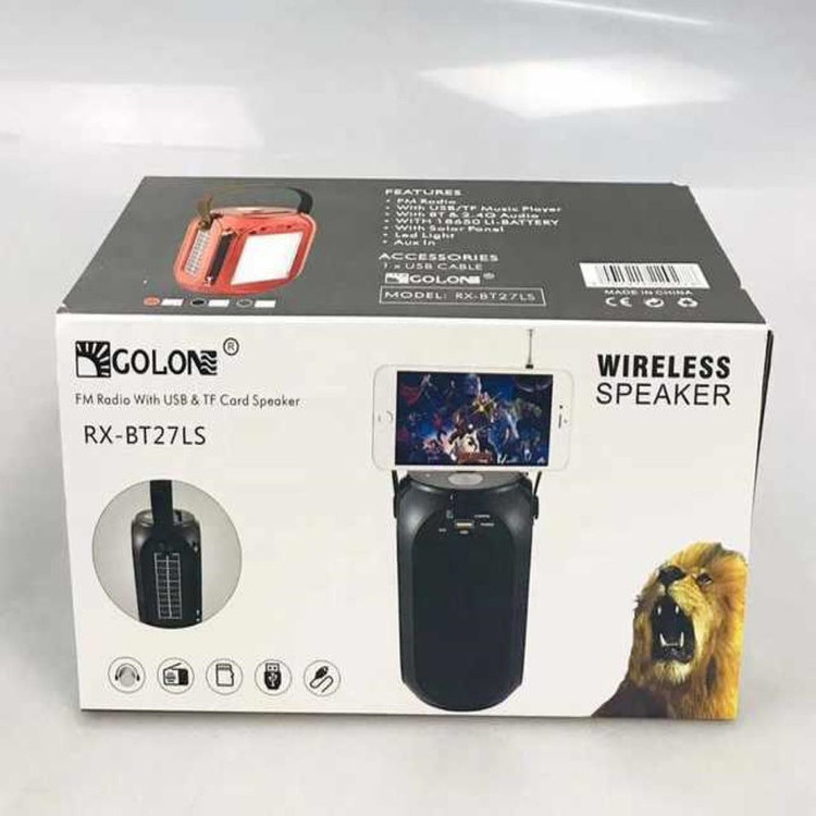 رادیو اسپیکر مدل RX-BT27LS محصول شرکت گولون میباشد که قابلیت اتصال به مموری کارتUSBوAUX را دارد . اتصال با بلوتوث، فلش و AUX برای پخش آهنگ های تلفن همراه قابلیت دیگر اسپیکر میباشد.همچنین مجهز به باطری قوی جهت استفاده طولانی مدت و نیز شارژ خورشیدی می باشد که مناسب جهت کوهنوردی و کمپینگ بوده و دارای چراغ روشنایی LED چند حالته نیز هست.
