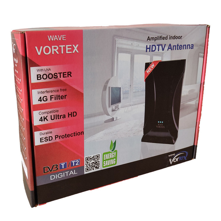 توضیحات آنتنهای رومیزی نسل جدیدی از آنتنهای تلویزیون و گیرندههای دیجیتال هستند که دیگر دردسرهای آنتنهای هوایی قدیمی را ندارند. آنتن رومیزی به راحتی داخل خانه یا محل کار قابل نصب است و فقط کافی است آن را به تلویزیون یا گیرنده دیجیتال متصل و کانال های تلویزیونی را دریافت نمائید.آنتن رومیزی ورتکس VORTEX از آنتنهای نسل جدید رومیزی است که امکانات و کیفیت بالایی در دریافت امواج تلویزیونی دارد. انتن رومیزی ورتکس VORTEX قابل اتصال به تلویزیونهای LCD, LED و plasma و 3D و گیرندههای دیجیتال میباشد و کاملا با استانداردهای دیجیتالی DVB-T و DVBT-2 نیز مطابقت دارد. این آنتن مجهز به سه تقویت کننده (آمپلی فایر) میباشد و میتواند سیگنالهای تلویزیونی را با کیفیت بالا دریافت و برنامه های تلویزیونی را بدون نویز پخش نماید. این آنتن در هر طبقه ای و بدون مشکل کار میکند و با برق کار میکند.