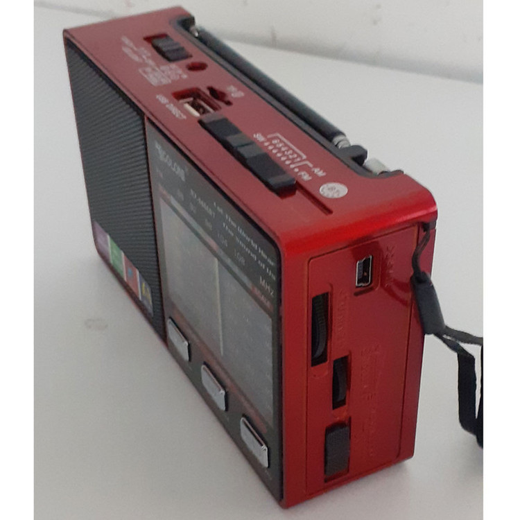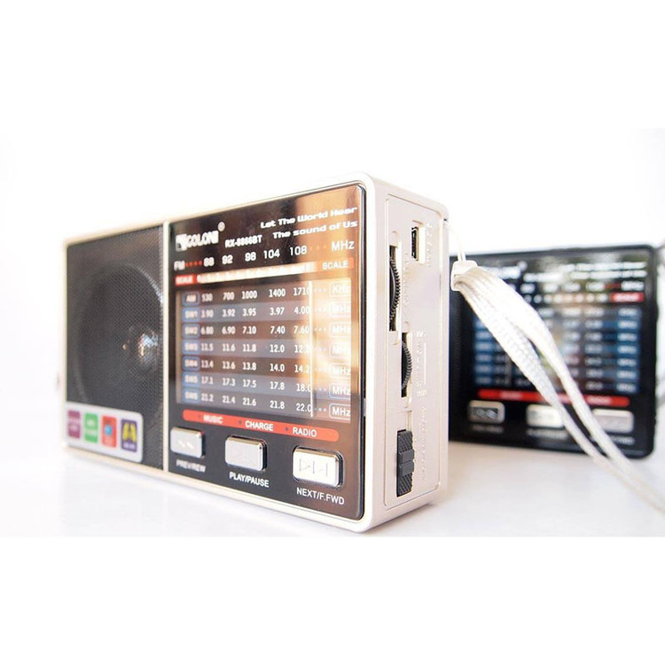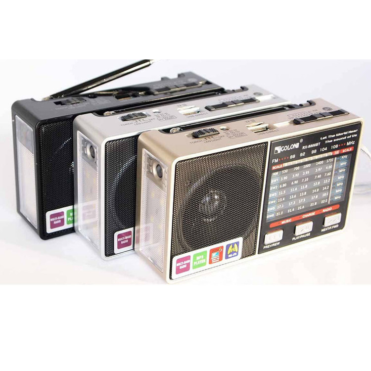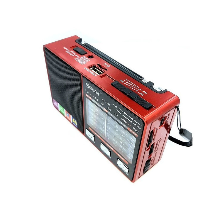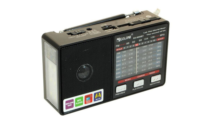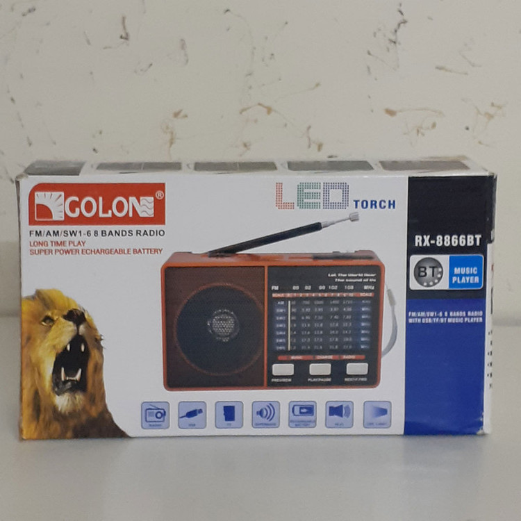 رادیو Golon RX-8866 از رادیو های کوچکی است که به خاطر ابعادش شما قادر به جابجایی راحت تر آن هم هستید. بندی که در گوشه ی آن قرار داده شده، شما را قادر به آسان تر جابجا کردن رادیو می کند. می توانید بند را دور مچ خود قرار دهید و رادیو را همراه خود داشته باشید. شاید این گونه از رادیو ها را بیشتر در مغازه ها و خانه های قدیمی دیده باشید که در حال پخش رادیو هستند. اما شما می توانید با استفاده از Golon 8866BT ، به غیر از گوش دادن به موج های رادیویی ، به موسیقی هم گوش دهید. این محصول دارای پورت های TF و USB می باشد که بدین ترتیب به شما امکان گوش دادن موسیقی را از Micro SD و فلش مموری می دهد. افزون بر پورت های نام برده شده، شما همچنین می توانید با اتصال بلوتوث دستگاه های مختلف خود مثل گوشی ، لپتاپ و…، به این رادیو ، از این طریق هم به گوش دادن موسیقی بپردازید. Golon RX-8866 توانایی پشتیبانی از موج های FM / AM / SW1-6 را دارد و با صفحه ی تنظیم موجی که که دارد شما را از موج و فرکانسی که استفاده می کنید، مطلع می سازد. برای دریافت قوی تر فرکانس ها، پشت این محصول آنتنی قرار داده شده است که به این روند کمک بیشتری می کند. در RX-8866 کلید های کنترل موسیقی و تنظیم رادیو ، در کنار و بالای بدنه قرار گرفته اند. همچنین کلیدی برای روشن و خاموش کردن چراغ قرار داده شده روی رادیو ، در بالای آن تعبیه شده تا در مواقع لزوم، از نور آن استفاده کنید. علاوه بر تأمین انرژی Golon RX-8866 از برق شهری، شما می توانید از دو نوع باتری BL-5C(نوکیایی) و باتری قلمی شارژی به طور جداگانه هم بهره ببرید و با کابل MiniUSB که در درون جعبه آن قرار داده شده است، به شارژ این باتری بپردازید.