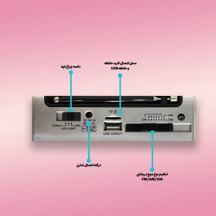 دارای سه موج رادیو اتصال بلوتوث-کارت حافظه-USB دارای بند آویز دست دارای چراغ قوه اس ام دی سیستم عاملهای قابل پشتیبانی IOS,Android, Windows