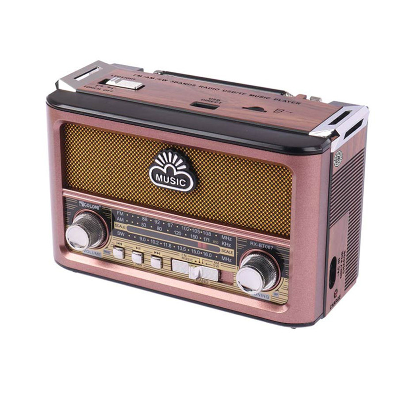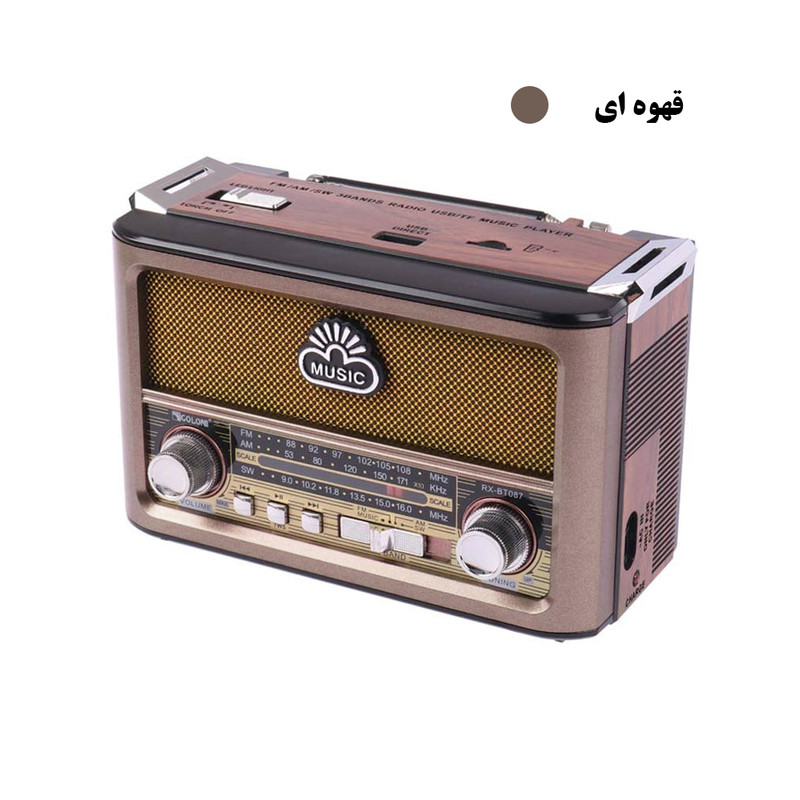 کمپانی GOLON یکی از معروفترین شرکتهای تولیدکننده رادیو و اسپیکر در دنیا است. رادیو گولون مدل RX-BT087 یکی از محصولات شرکت Golon است. این رادیو قابلیت دریافت رادیویی در امواج FM در بازه 88 الی 108 مگاهرتز، موج AM در بازه فرکانسی 53 تا 171 کیلوهرتز، موج SW در بازه فرکانسی 5٫9 الی 18 مگاهرتز را دارد. همچنین این دستگاه قابلیت پخش موسیقی از طریق حافظه USB، کارت حافظه microSD و بلوتوث را دارا است و کیفیت صدای مناسبی دارد. تامین انرژی رادیو اسپیکر Golon RX-BT087 از طریق 2 عدد باتری UM-1 یا یک عدد باتری لیتیومی مدل 18650 قابل شارژ با ظرفیت 2200 میلی آمپر صورت می گیرد. از طرفی دیگر می توانید دستگاه را بدون نیاز به باتری به صورت مستیقیم به برق شهری متصل کنید. طراحی کلاسیک بدنه با استفاده از متریال پلاستیک و روکش طرح چوب، برخورداری از آنتن جمع شونده با قابلیت تنظیم میزان ارتفاع تا 30 سانتی متر از دیگر ویژگی های این محصول است. کلیدهای کنترلی به منظور مدیریت موزیک در حال پخش، تنظیم امواج رادیویی، تنظیم صدا بر روی پنل جلویی دستگاه تعبیه شده اند. در سمت راست دستگاه درگاه اتصال به برق شهری وجود دارد. سمت چپ دستگاه 2 عدد چراغ قوه تعبیه شده است و بر روی دستگاه درگاه حافظه USB، درگاه حافظه microSD و کلید چراغ قوه تعبیه شده است.