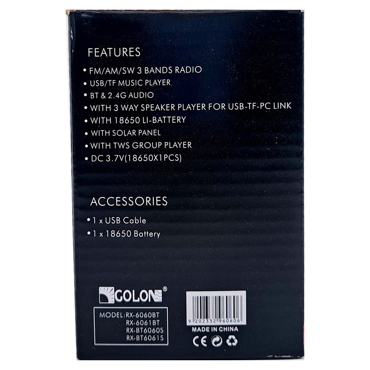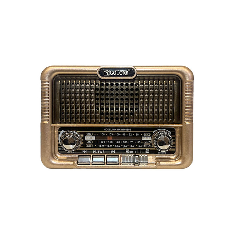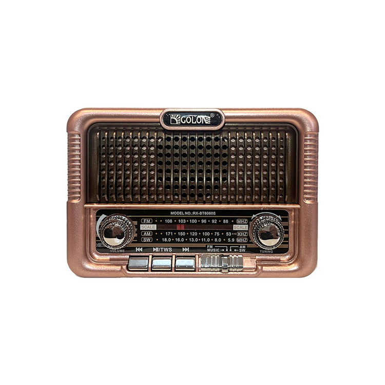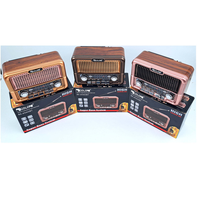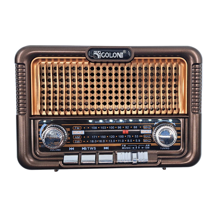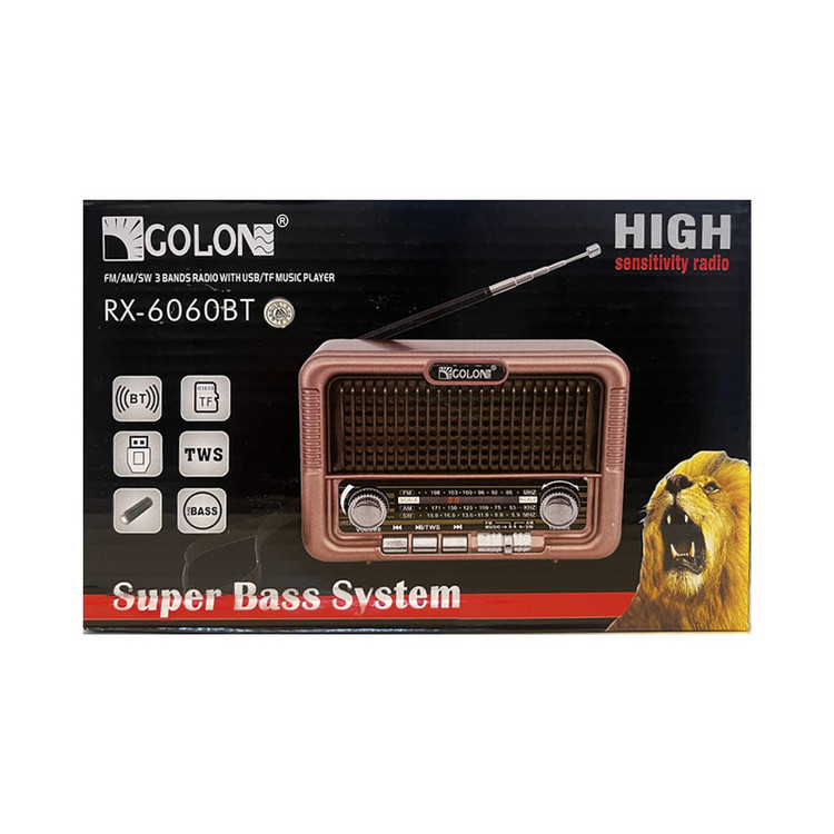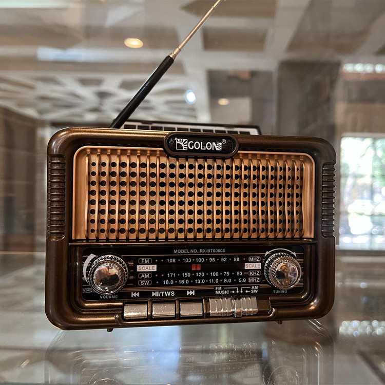 کمپانی GOLON یکی از معروفترین شرکتهای تولیدکننده رادیو و اسپیکر در دنیا است. رادیو گولون مدل RX-BT6060S یکی از محصولات جدید این شرکت است. این رادیو قابلیت دریافت امواج رادیویی FM در بازه 88 الی 108 مگاهرتز، موج AM در بازه فرکانسی 530 تا 1710 کیلوهرتز، موج SW در بازه فرکانسی 5٫9 الی 18 مگاهرتز را دارد. همچنین این دستگاه قابلیت پخش موسیقی از طریق حافظه USB، کارت حافظه microSD و بلوتوث طراحیشده است و کیفیت صدای بالایی دارد. تامین انرژی رادیو اسپیکر Golon RX-BT6060S از طریق باتری لیتیومی مدل 18650 قابل شارژ با ظرفیت 2200 میلی آمپر و همچنین پنل خورشیدی در قسمت بالای دستگاه صورت می گیرد. از طرفی دیگر می توانید دستگاه را بدون نیاز به باتری به وسیله آدابتور به برق شهری متصل کنید. طراحی کلاسیک بدنه با استفاده از پلاستیک مرغوب با طرح چوب صورت گرفته است؛ برخورداری از آنتن جمع شونده با قابلیت تنظیم میزان ارتفاع تا 30 سانتی متر از دیگر ویژگی های این محصول است. کلیدهای کنترلی به منظور مدیریت موزیک در حال پخش، تنظیم امواج رادیویی، تنظیم صدا بر روی پنل جلویی دستگاه تعبیه شده اند. در سمت چپ دستگاه علاوه بر کلید تنظیم حالت پخش، درگاه کارت حافظه USB، درگاه حافظه microSD و چراغ شارژ تعبیه شده است. همراه محصول سیم شارژ microUSB، بند و باتری لیتیومی 18650 ارسال می شود.
