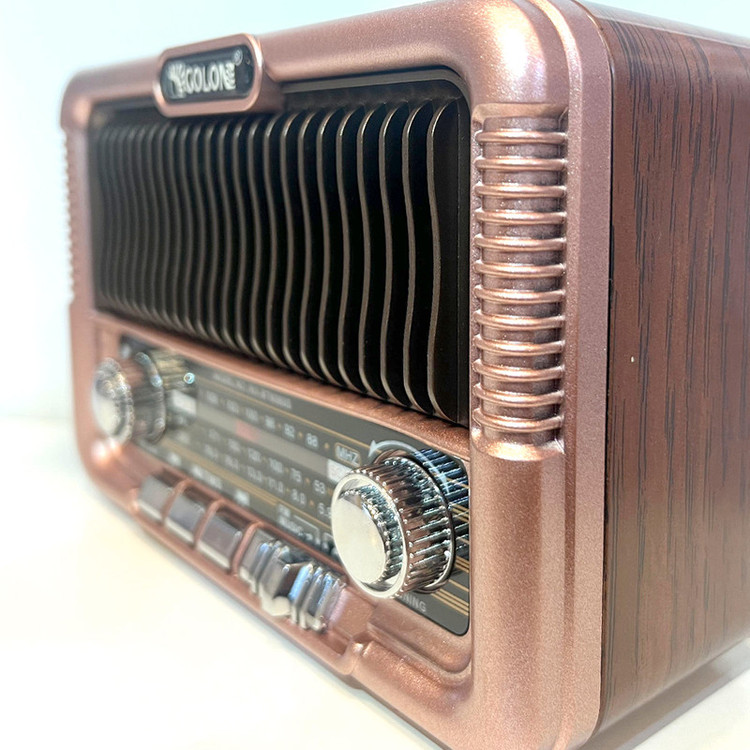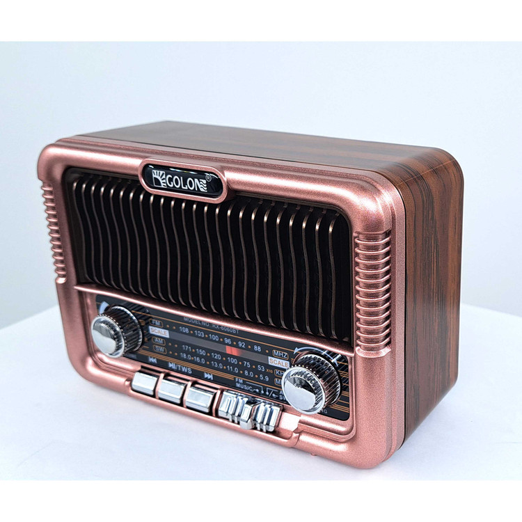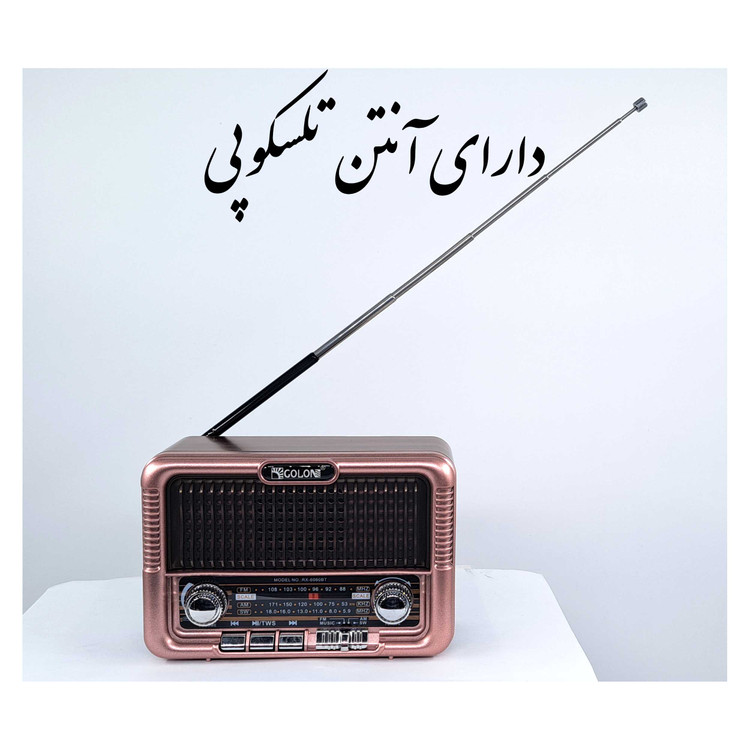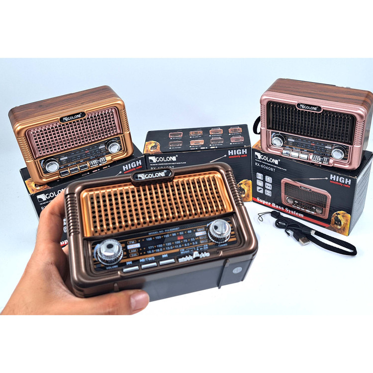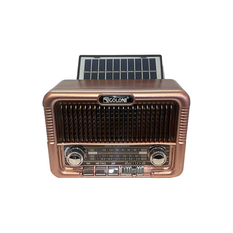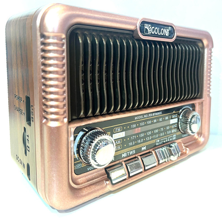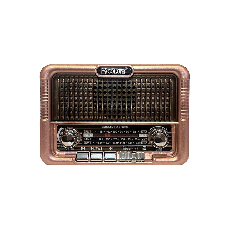 کمپانی GOLON یکی از معروفترین شرکتهای تولیدکننده رادیو و اسپیکر در دنیا است. رادیو گولون مدل RX-BT6060S یکی از محصولات جدید این شرکت است. این رادیو قابلیت دریافت امواج رادیویی FM در بازه 88 الی 108 مگاهرتز، موج AM در بازه فرکانسی 530 تا 1710 کیلوهرتز، موج SW در بازه فرکانسی 5٫9 الی 18 مگاهرتز را دارد. همچنین این دستگاه قابلیت پخش موسیقی از طریق حافظه USB، کارت حافظه microSD و بلوتوث طراحیشده است و کیفیت صدای بالایی دارد. تامین انرژی رادیو اسپیکر Golon RX-BT6060S از طریق باتری لیتیومی مدل 18650 قابل شارژ با ظرفیت 2200 میلی آمپر و همچنین پنل خورشیدی در قسمت بالای دستگاه صورت می گیرد. از طرفی دیگر می توانید دستگاه را بدون نیاز به باتری به وسیله آدابتور به برق شهری متصل کنید. طراحی کلاسیک بدنه با استفاده از پلاستیک مرغوب با طرح چوب صورت گرفته است؛ برخورداری از آنتن جمع شونده با قابلیت تنظیم میزان ارتفاع تا 30 سانتی متر از دیگر ویژگی های این محصول است. کلیدهای کنترلی به منظور مدیریت موزیک در حال پخش، تنظیم امواج رادیویی، تنظیم صدا بر روی پنل جلویی دستگاه تعبیه شده اند. در سمت چپ دستگاه علاوه بر کلید تنظیم حالت پخش، درگاه کارت حافظه USB، درگاه حافظه microSD و چراغ شارژ تعبیه شده است. همراه محصول سیم شارژ microUSB، بند و باتری لیتیومی 18650 ارسال می شود.