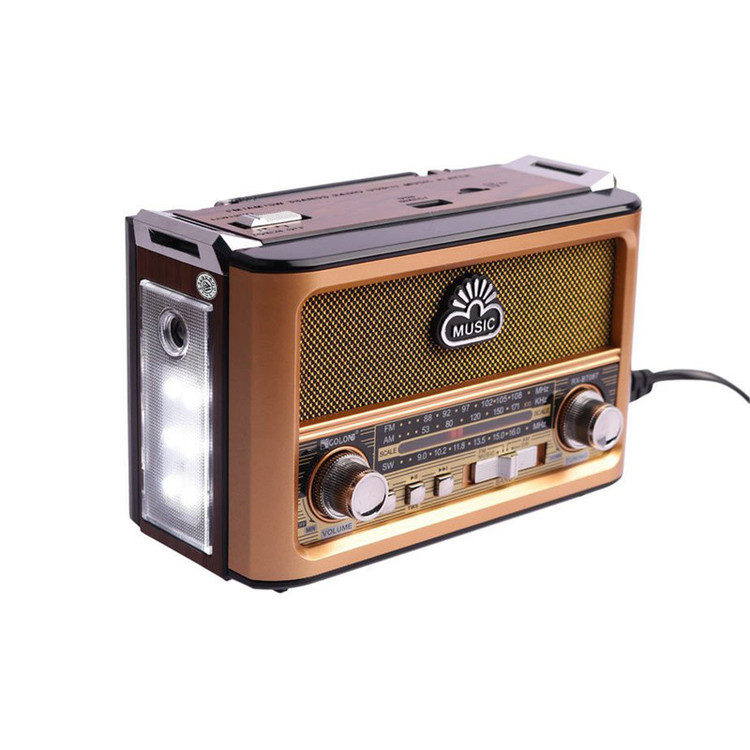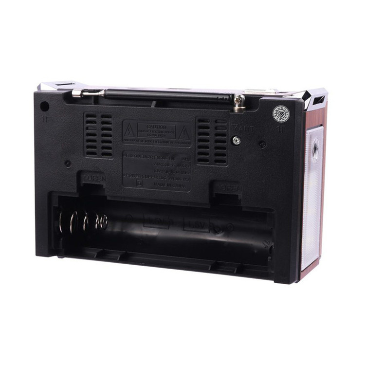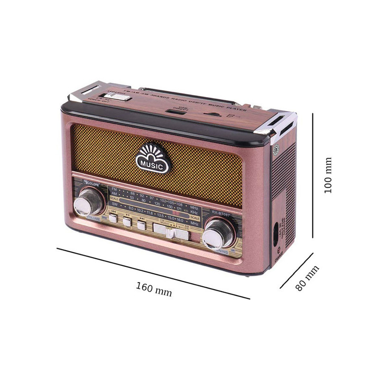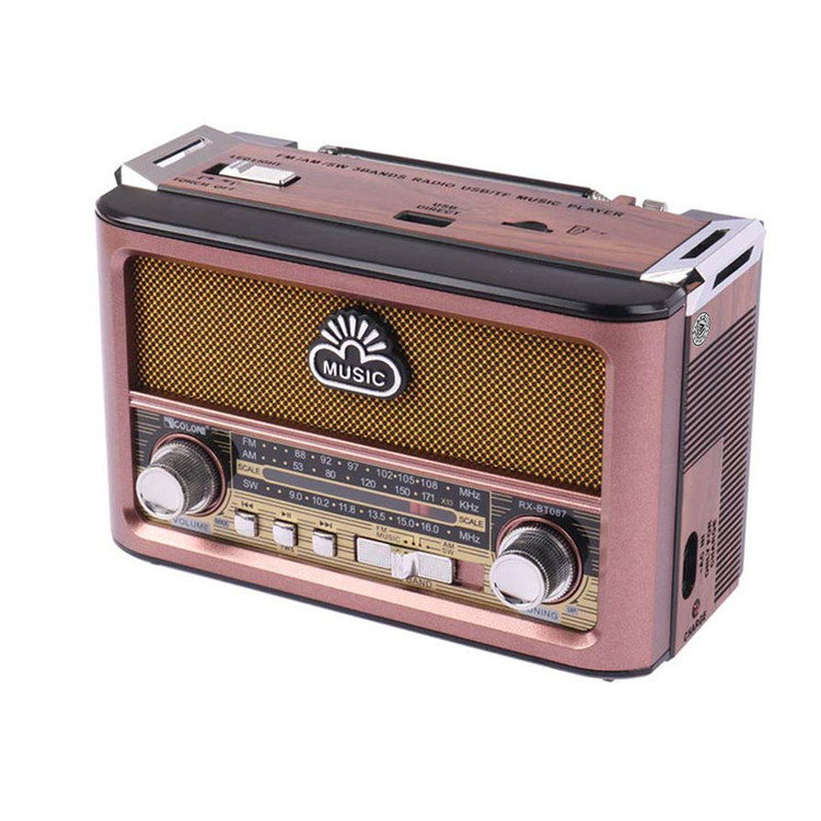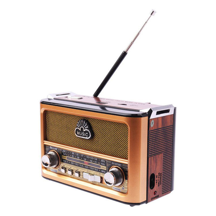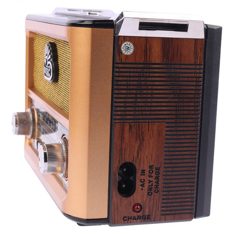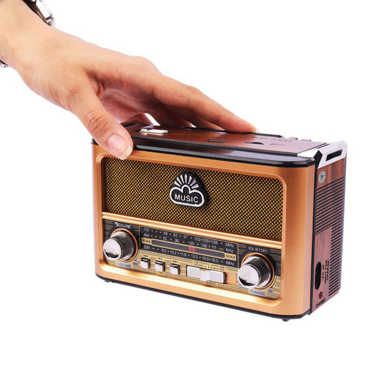 با رویکار آمدن شبکه های مجازی و اینترنت همچنان رادیو طرفداران پرو پا قرص خود را دارد . این دستگاه با طراحی کلاسیک به شکل رادیوهای قدیمی اما با کارکردی امروزی میباشد و توانایی پخش فایل های صوتی با فرمت MP3 را از طریق درگاه های ورودی AUX و USB و 2 پورت کارت حافظه TF/ SDدارد. این رادیوی علاوه بر امکان استفاده از برق شهری با داشتن باتری داخلی قابل شارژ و امکان استفاده از 4 باتری معمولی مدل UM-1 در همه جا میتواند همراه خوبی برای شما باشد . با خرید این محصول کاربردی شما تنها صاحب یک رادیو نگردیده اید بلکه صاحب یک پلیر قوی هم شده اید .با داشتن آنتن تلسکوپی بر روی دستگاه به راحتی میتوانید در هر مکانی به ایستگاه رادیویی دلخواه خود متصل و شنیدن رادیو لذت ببرید . این رادیو باداشتن 3 درگاه ورودی : USB و فلش در دو سایز SD , TF و همچنین اتصال از طریق بلوتوث میتواند یک پلیر کاربردی با صدای عالی برای مسافرت ها و دورهمی های شما باشد . از دیگر امکانات این دستگاه میتوان به بلندگوی با کیفیت استریو و ورودی AUX اشاره نمود .