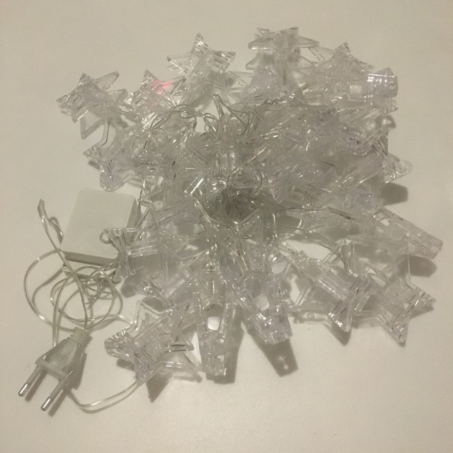 ریسه گیره ای طرح ستاره از سری محصولات تزئینی دکوری و مناسب دیزاین های نوری است که میتواند با جلوه بسیار زیبایی فضای اتاق خواب و … شما را متحول سازد. برای اویز کردن عکس ها،نوشته ها و یادگارهای شما مناسب است.دارای ۲۸ گیره ستاره ای میباشد.کنترلر متصل به ریسه میتواند ۸ حالت نوردهی برای ریسه ایجاد کند.از برق شهری تغذیه میکند.