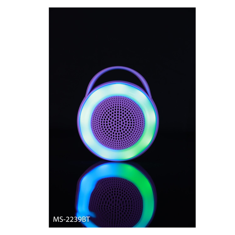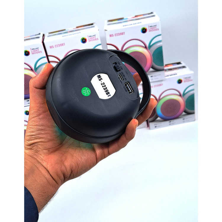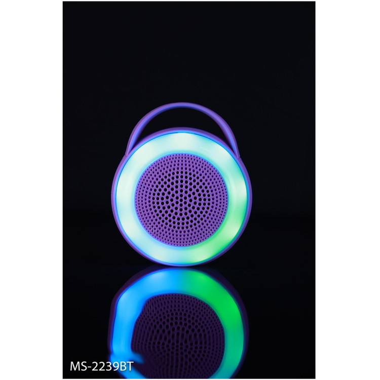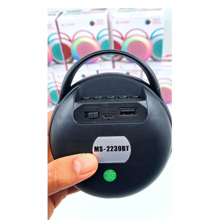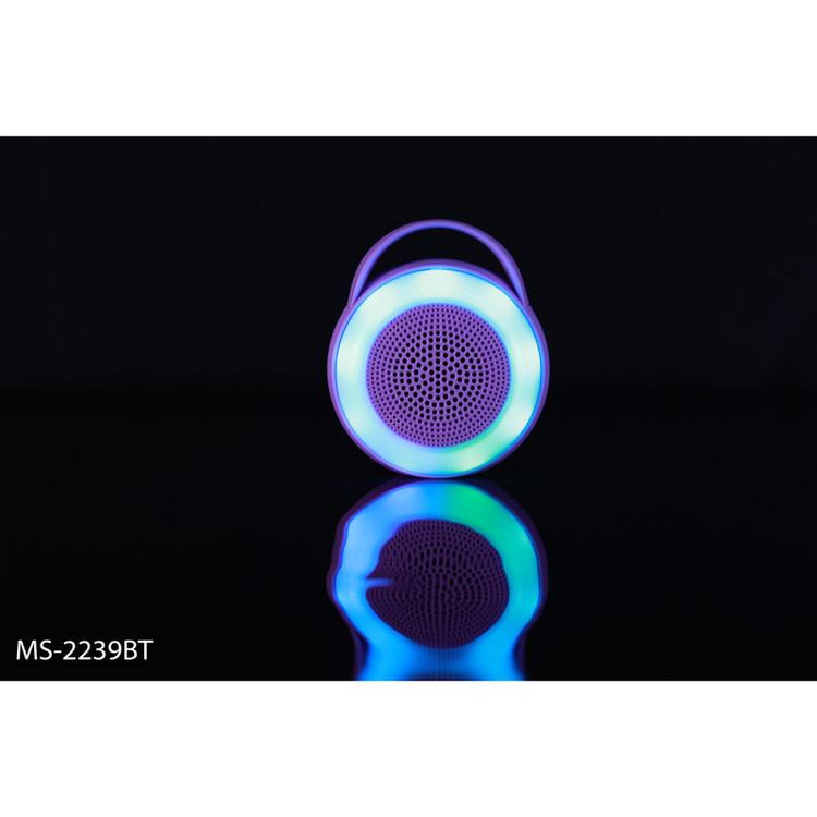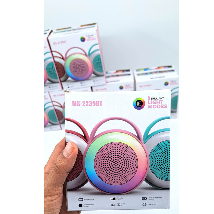 اسپیکر بلوتوثی قابل حمل مدل MS-2239BT با توجه به ابعاد و وزن مناسب خود میتواند در هر جایی لذت گوش دادن به موسیقی را برای کاربران فراهم کند. این اسپیکر همراه، دارای درایو و نورپردازی RGB است تا این اسپیکر بتواند صدا را به صورت مستقیم و با بیشترین کیفیت به گوش کاربران برساند و جلوههای بصری بسیار زیبایی به آنها ارائه کند. پورتهای اتصال این اسپیکر در قسمت پشتی آن قرار دارند و به هیچ عنوان زیبایی قسمت جلویی این محصول را دچار اختلال نمیکنند. کلیدهای کنترل موسیقی و صدا هم در قسمت بالا و پشت اسپیکر بلوتوثی MS-2239BT قرار دارند و دسترسی به آنها کار دشواری به نظر نمیرسد. درایو اصلی MS-2239BT قابلیت ارائه توان خروجی حداکثر 5 وات را در بازه فرکانسی 100 هرتز الی 20 کیلوهرتز ارائه میکند تا بلندی و شفافیت صدای نسبتا مناسبی را هنگام گوش دادن به موسیقی از این اسپیکر شاهد باشیم. اتصالات اسپیکر به حافظه جانبی و دستگاهها توسط پورتهای USB،انجام میشود. امکان اتصال بدون سیم نیز توسط بلوتوث داخلی MS-2239BT وجود دارد و کاربران به سادگی میتوانند تلفن همراه، تبلت و دیگر دستگاههای بلوتوثی خود را به سادگی با این اسپیکر همگامسازی کنند. تامین انرژی این اسپیکر نیز برعهده باتری 1200 میلیآمپر ساعتی است که از شارژدهی مناسبی نسبت به بلندی صدا برخوردار است.سایز این اسپیکر 2 اینچ با ابعاد 14x12x7 سانتی متر می باشد که آن را برای حمل ، آسان تر کرده است .