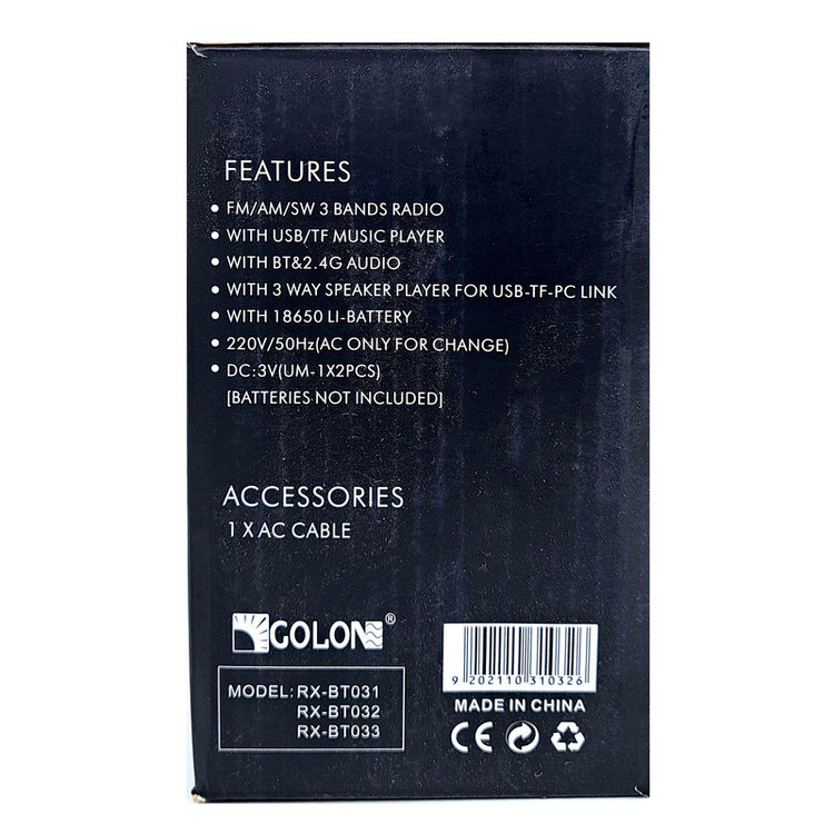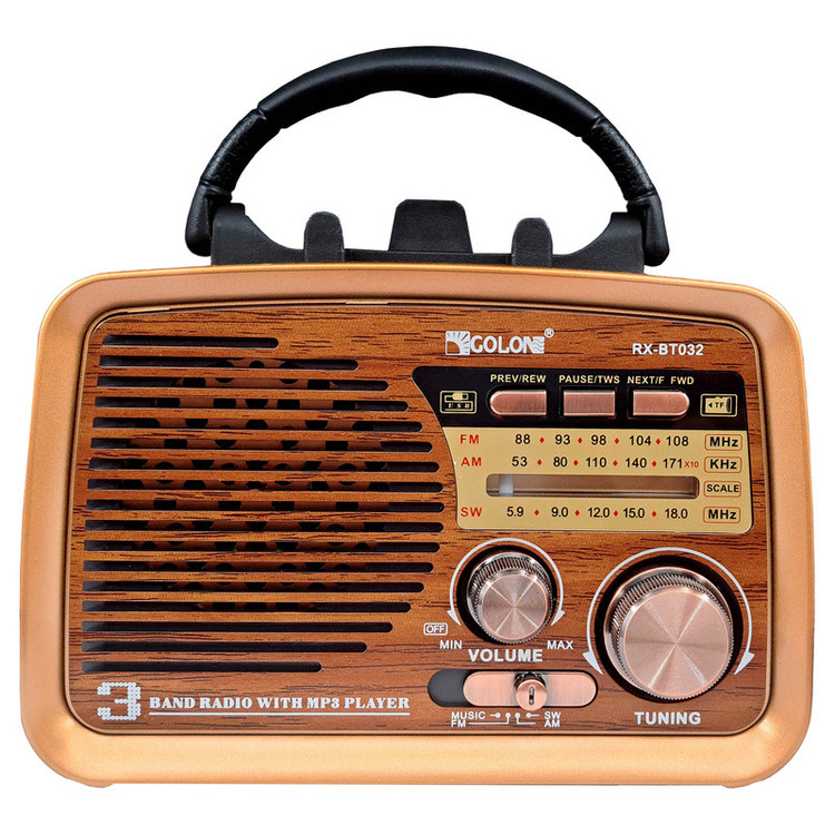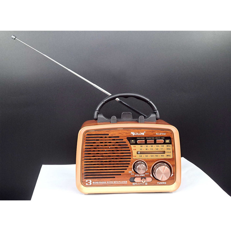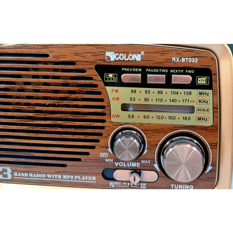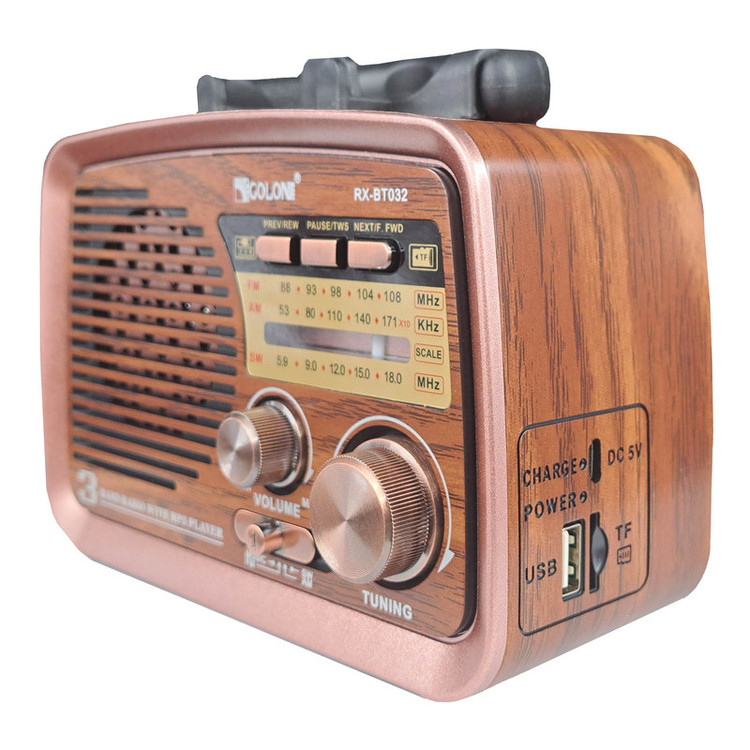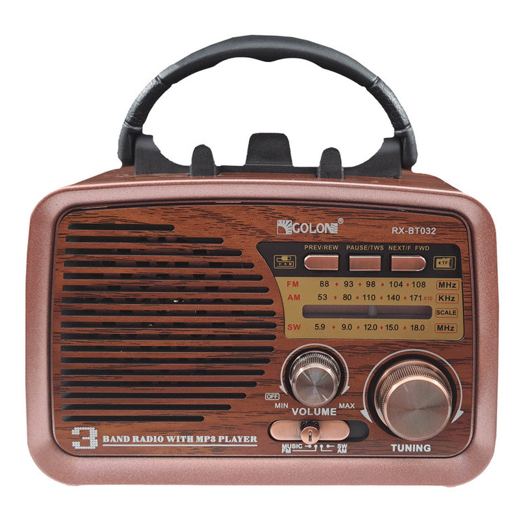 با وجود پیشرفت تکنولوژی باز هم رادیو طرفداران خاص خودش را دارد. اسپیکر بلوتوثی RX-BT032 زیبا و جذاب با امکانات پیشرفته امروزی با طرح نوستالژیک خود به صورت رادیو های قدیمی، یادآور خاطرات بسیار شیرینی است. در این دستگاه نمایشگر تنظیم ایستگاه رادیویی مانند نسل رادیوهای قدیمی طراحی شده است . این اسپیکر گیرنده امواج رادیویی FM، AM و SW می باشد و قابلیت پشتیبانی از USB و TF CARD را داشته و همچنین دارای قابلیت اتصال بلوتوث می باشد. انرژی این اسپیکر به 3 صورت قابل تامین است:برق مستقیم شهری،باتری قابل شارژ و یا 2 عدد باتری قلمی بزرگ.این اسپیکر در همه جا میتواند همراه خوبی برای شما باشد. این اسپیکر با داشتن آنتن تلسکوپی بر روی خود به راحتی میتواند در هر مکانی به ایستگاه رادیویی دلخواه شما متصل و شما را با پخش رادیو لذت خاصی دهد.همچنین وجود دسته بر روی بدنه حمل این اسپیکر را راحت کرده است.در کل میتوان گفت این اسپیکر با کیفیت و امکانات بالایی که دارد کاملا رضایت مشتری را جلب مینماید. ابعاد این اسپیکر 12x8x16 سانتیمتر و وزن آن 620 گرم میباشد .شارژ این اسپیکر هم از طریق کابل دوشیاره برق 220 ولت شهری و هم از طریق MicroUSB قابل شارژ است .