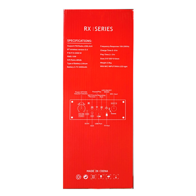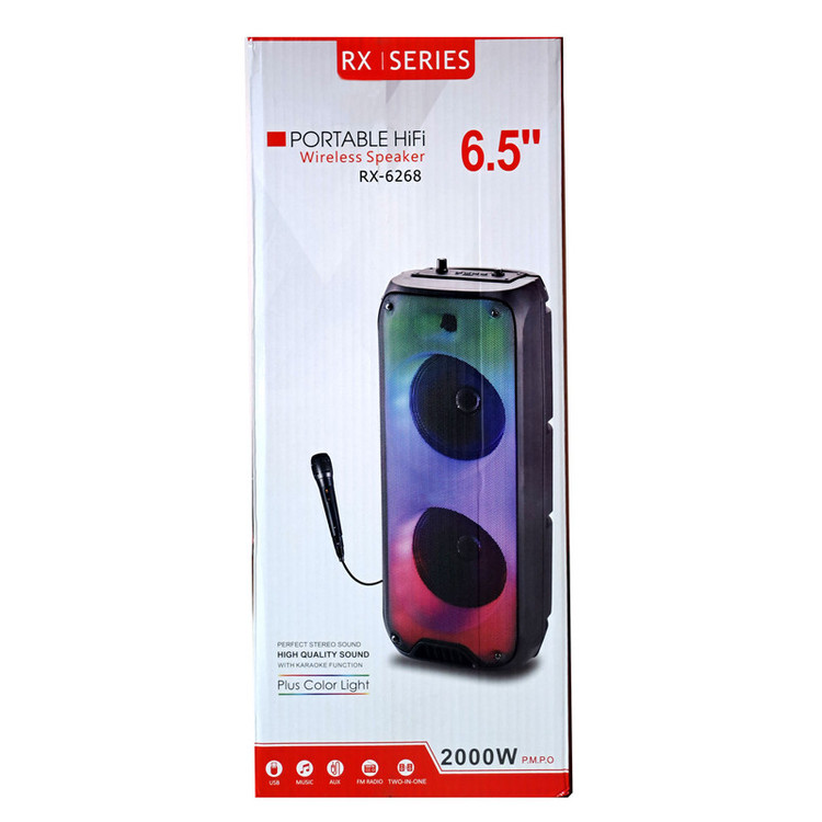 اسپیکر مدل RX-6268 جدیدترین مدل از اسپیکرهای سری پارتی باکس PartyBox می باشد.دو باند قدرتمند 6.5 اینچی حرفهای این اسپیکر صدای موسیقی را با بیس و وضوحبالا پخش میکنند . یکی از راه های اتصال به اسپیکر، بلوتوث می باشد کافی است بلوتوث موبایل یا تبلت خود را روشن کنید، اسپیکر را جستجو کرده و متصل شوید. نسخه بلوتوث این اسپیکر 5 میباشد. میتوانید آهنگهای موردعلاقه خود را در یک فلش مموری یا مموری کارت ذخیره نموده و از طریق پورت USB یا (مموری کارت)TFبه اسپیکر متصل کرده و پخشکنید. همچنین میتوانید توسط کابل AUX دستگاه خود را از طریق ورودی 3.5 میلیمتری به اسپیکر متصل کنید. حالا فقط دکمه پخش را فشار داده و از شنیدن موسیقی موردعلاقه خود لذت ببرید. تکنولوژی TWS قابلیت اتصال دو اسپیکر به هم و پخش یکسان موسیقی را برای شما فراهم کرده است . به این صورت که دواسپیکر را از طریق بلوتوث به هم متصل نموده و سپس با گوشی یا تبلت از طریق بلوتوث به یک اسپیکر متصل شده و موزیک را از هردو اسپیکر به صورت همزمان گوش دهید . توان خروجی اسمی این اسپیکر 10 وات می باشد که میتواند فضای بین 100 تا 150 متر را پوشش دهد . این اسپیکر دارای یک میکروفن سیم دار میباشد که برای قرارگرفتن آن در پشت اسپیکر محلی تعبیه گردیده است. این اسپیکر دارای 10 مدل رقص نورمیباشد که زیبایی خاصی را به این اسپیکر بخشیده است همچنین میتوانید به راحتی آن را خاموش یا روشن کنید . ریموت کنترل این اسپیکر امکاناتی همچون تغییر اکولایزر ، تغییرMode ، تغییر میزان صدا ، تغییر موزیک و... را به شما میدهد. شارژ این اسپیکر از طریق MicroUSB با شارژر های اندروید امکان پذیراست . ارتفاع این اسپیکر 50 سانتی متر و وزن آن 2.2 کیلوگرم می باشد. این اسپیکر دارای باتری لیتیومی داخلی به ظرفیت 2400 میلی آمپر و مدت زمان پخش این اسپیکر بستگی به میزان ولوم دستگاه بین 2 تا 3 ساعت می باشد و زمان نیاز برای شارژ کامل آن 5 الی 8 ساعت (بسته به شارژر) است و پس از شارژ کامل چراغ شارژ آن خاموش میشود. به گفته ی شرکت سازنده این اسپیکر این اسپیکر قابلت رکورد و ذخیره روی فلش مموری را نیز دارد . این اسپیکر دارای رادیو FM نیز میباشد که به راحتی با فشردن کلید Mode میتوانید روی رادیو سوییچ کرده و با زدن کلید پلی به جستجوی شبکه های رادیویی بپردازید .