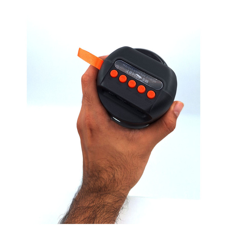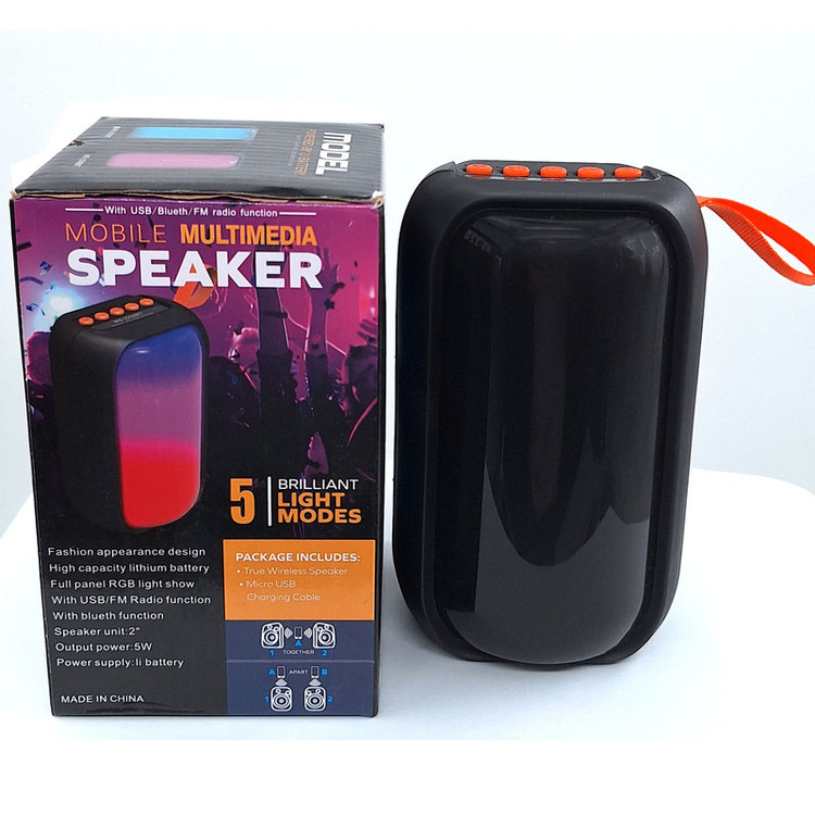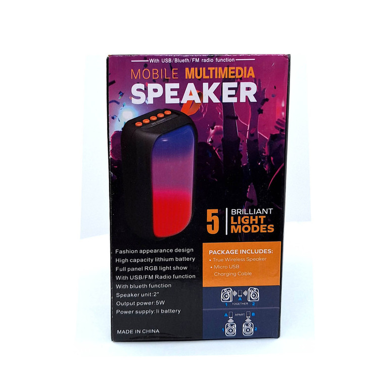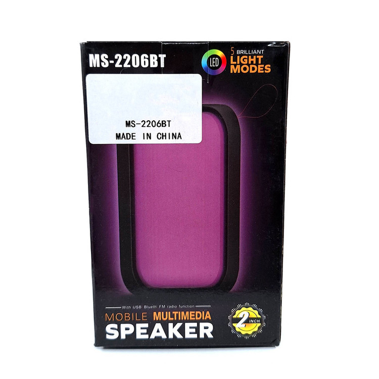 اسپیکر بلوتوثی قابل حمل مدل MS-2206BT با توجه به ابعاد و وزن مناسب خود میتواند در هر جایی لذت گوش دادن به موسیقی را برای کاربران فراهم کند. این اسپیکر همراه، دارای درایو و نورپردازی RGB است تا این اسپیکر بتواند صدا را به صورت مستقیم و با بیشترین کیفیت به گوش کاربران برساند و جلوههای بصری بسیار زیبایی به آنها ارائه کند. پورتهای اتصال این اسپیکر در قسمت پشتی آن قرار دارند و به هیچ عنوان زیبایی قسمت جلویی این محصول را دچار اختلال نمیکنند. کلیدهای کنترل موسیقی و صدا هم در قسمت بالا و پشت اسپیکر بلوتوثی MS-2206BT قرار دارند و دسترسی به آنها کار دشواری به نظر نمیرسد. درایو اصلی MS-2206BT قابلیت ارائه توان خروجی حداکثر 5 وات ارائه میکند تا بلندی و شفافیت صدای نسبتا مناسبی را هنگام گوش دادن به موسیقی از این اسپیکر شاهد باشیم. اتصالات اسپیکر به حافظه جانبی و دستگاهها توسط پورتهای USB،انجام میشود. امکان اتصال بدون سیم نیز توسط بلوتوث داخلی MS-2206BT وجود دارد و کاربران به سادگی میتوانند تلفن همراه، تبلت و دیگر دستگاههای بلوتوثی خود را به سادگی با این اسپیکر همگامسازی کنند. این اسپیکر دارای رادیو FM می باشد که از طریق کلید Mode می توانید از آن استفاده کنید. تامین انرژی این اسپیکر نیز برعهده باتری شارژی لیتیومی است که از شارژدهی مناسبی نسبت به بلندی صدا برخوردار است.سایز این اسپیکر 2 اینچ با ابعاد14*9 سانتی متر می باشد که آن را برای حمل ، آسان تر کرده است .این اسپیکر دارای رقص نور متنوع می باشد که با کلید LED میتوانید نسبت به تغییر نوع ، خاموش/روشن کردن آن اقدام نمایید. این اسپیکر دارای بند می باشد که میتوانید به راحتی آن را به کیف یا کوله ی خود آویز کنید.