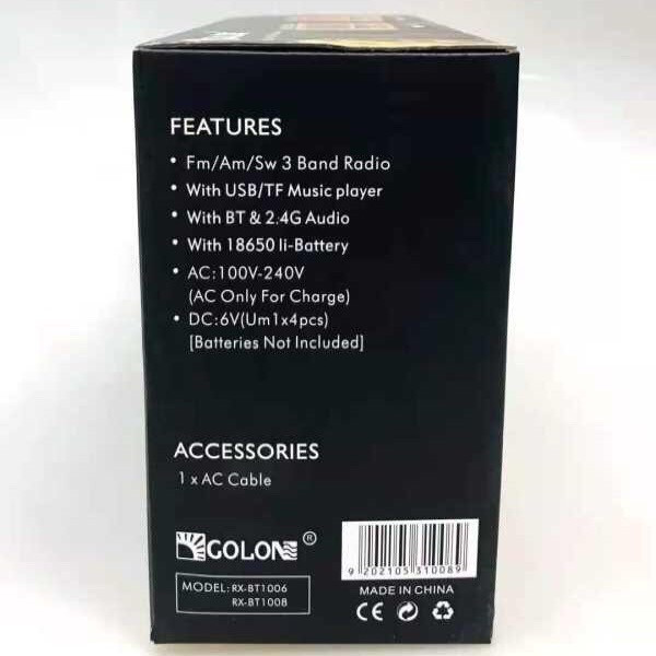 گیرنده 3 موج FM، AM و SW رادیویی است که سیگنال ها را شفاف و بدون نویز دریافت میکند. اسپیکر Golon 1006 با ظاهری نوستالژیک و زیبا از فناوری بلوتوث نیز پشتیبانی میکند. از دیگر مشخصههای این اسپیکر میتوان به درگاه USB برای اتصال فلش، درگاه TF برای اتصال مموری SD، نشانگر شارژ، پخش صدای قوی، اندازه مناسب و دسته جهت حمل آسان، نشانگر حالت استفاده، دکمه های فیزیکی mode، پخش و توقف موزیک و… اشاره کرد. رادیو گولون Bt1006 طرح چوب دارای یک باتری 18650 قابل شارژ است و از طریق اتصال کابل برق آن به برق 220 ولت شهری این باتری شارژ میگردد. مدت زمان شارژ رادیو اسپیکر مدل 1006 گولون 1.5 الی 2 ساعت میباشد و بهتر است در هنگام شارژ آن را روشن نکنید تا فرایند شارژ تکمیل گردد. همچنین شما میتوانید از چهار عدد باتری سایز بزرگ (D) نیز برای تغذیه این اسپیکر استفاده نمایید.