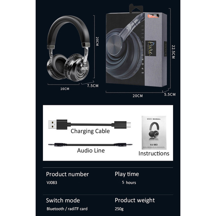 شرکت «BH JBL» بی اچ جی بی ال بهتازگی محصولی را تحت عنوان مدل «VJ083» روانه بازار کرده که درواقع یک هدفون بیسیم است که از طریق فناوری بلوتوث نسخه 5 به تلفنهمراه یا پخشکننده صوتی متصل میشود. اگر تلفنهمراه یا پخشکننده صوتی شما از بلوتوث پشتیبانی نمیکند، جای هیچگونه نگرانی نیست. مهندسان شرکت BH JBL هدفون VJ083را به درگاه 3.5 میلیمتری صدا تجهیز کردهاند تا به کمک آن بتوان اقدام به اتصال باسیم کرد. جنس پوشش روی کاپ صدای این محصول از پلاستیک نرم است که باعث میشود هنگام استفاده بلندمدت از آن احساس خستگی به کاربر منتقل نشود. قسمت هدبند VJ083قابلیت تغییر ارتفاع را دارد که این ویژگی باعث میشود این هدفون گزینه مناسبی برای همه افراد باشد. بازوهای هدفون از جنس فلز بوده و مقاومت خوبی به آن بخشیده است . روی این محصول کلید برای خاموش یا روشن ، مدیریت موزیک و صدا، درگاه AUX و سوکت شارژ MicroUSB دستگاه به چشم میخورد یک شیار کارت حافظه هم برای پخشموسیقی بدون نیاز به تلفنهمراه یا پخشکننده صوتی وجود دارد. این هدفون از تکنولوژی 8D پشتیبانی و با بیس و پخش صدای با کیفیت بدون شک شگفتزده خواهید شد. تنوع رنگی زیادی برای این مدل در نظر گرفته شده است تا کاربران بنا به سلیقهی خود، قادر به انتخاب باشند. این هدفون مجهز به یک باتری لیتیوم داخلی است که بهسرعت شارژ میشود و بنا به کاربریاش میتواند تا 5 ساعت کار کند. برای شارژ آن، باید از کابل MicroUSB استفاده کنید که در جعبه موجود است. مدت زمان لازم برای شارژ این هدفون 1.5 ساعت است و دارای باطری قدرتمند 200میلی آمپر است. حتی با تمام شدن شارژ باتری این هدفون نگران نباشید . شما میتوانید با کابل AUX و اتصال آن به هدفون و دستگاه خود به صورت نامحدود از هدفون استفاده کنید .این هدفون دارای میکروفن داخلی می باشد که میتوانید از آن جهت مکالمه ، ضبط صدا استفاده کنید . برای تغییر MODE (تغییر از حالت های مختلف: بلوتوث /رادیو/-مموری کارت/AUX ) کافیست کلید + , - را همزمان به مدت 5 ثانیه نگه دارید این کار باعث تغییربین حالت های پخش می باشد . این هدفون برای تمامی افراد از جمله مالتی مدیا ، گیمرها و ...طراحی و ساخته شده است .