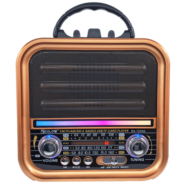 کمپانی GOLON یکی از معروفترین شرکتهای تولیدکننده رادیو و اسپیکر در دنیا است. رادیو گولون مدل RX-720SD یکی از محصولات جدید این شرکت است. این رادیو قابلیت دریافت امواج رادیویی FM در بازه 64 الی 108 مگاهرتز، موج AM در بازه فرکانسی 530 تا 1710 کیلوهرتز، موج SW در بازه فرکانسی 5٫9 الی 18 مگاهرتز را دارد. همچنین این دستگاه قابلیت پخش موسیقی از طریق حافظه USB، کارت حافظه MicroSDو بلوتوث طراحیشده است و کیفیت صدای بالایی دارد. تامین انرژی رادیو اسپیکر Golon RX-720SD از طریق باتری لیتیومی مدل 18650 قابل شارژ با ظرفیت 2200 میلی آمپر و همچنین پنل خورشیدی در قسمت بالای دستگاه صورت می گیرد. از طرفی دیگر می توانید دستگاه را بدون نیاز به باتری به وسیله آداپتور به برق شهری از طریق کابل تایپ سی متصل کنید. طراحی کلاسیک بدنه با استفاده از پلاستیک مرغوب با طرح چوب صورت گرفته است؛ برخورداری از آنتن جمع شونده با قابلیت تنظیم میزان ارتفاع تا 30 سانتی متر از دیگر ویژگی های این محصول است. این محصول دارای دسته تاشو جهت حمل آسان نیز میباشد . کلیدهای کنترلی به منظور مدیریت موزیک در حال پخش، تنظیم امواج رادیویی، تنظیم صدا و تنظیم رقص نور بر روی پنل جلویی دستگاه تعبیه شده اند. در سمت راست دستگاه درگاه USB، درگاه حافظه MicroSD ، درگاه تایپ سی جهت شارژ و چراغ شارژ تعبیه شده است. همراه محصول سیم شارژ تایپ سی جهت شارژ و باتری لیتیومی 18650 ارسال می شود. این رادیو دارای رقص نور زیبا است که در حالت اتصال بلوتوث، به چند مدل روشن و نمایی خاص به رادیو می بخشد.