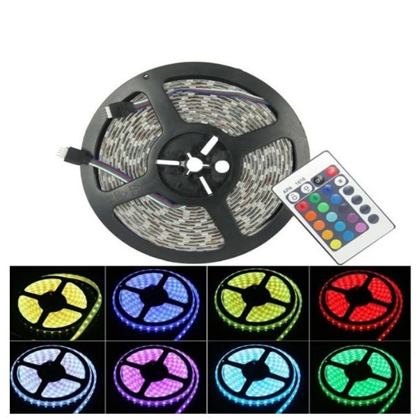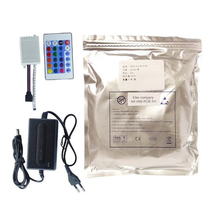 این پکیج شامل نوار ال ای دی پشت چسبدار چند رنگ 5 متری برند eller ، درایور کنترل RGB ، کنترل و آداپتور 12 ولت می باشد. از این ریسه می توانید در زیر کابینت، لبه پله ها، لبه های تخت و میز، کناره های دیوار ها و اپن یا نقاط دیگر استفاده کنید. ولتاژ کاری محصول 12 ولت است و خطر برق گرفتگی ندارد. در صورت نیاز میتوانید از هر پنج سانتی متر این محصول را برش بزنید و لحیم کنید و از قسمت های برش خورده استفاده کنید. این محصول دارای اکثر رنگهای ال ای دی است. شما میتوانید با کنترل رنگها را تغییر دهید و یا حالتهای مختلف رقص نور را انتخاب کنید. همچنین میتوان شدت نور را کم و زیاد کرد. تراکم ال ای دی در هر متر 60 عدد است که نور مناسبی برای نور پردازی فضاهای مختلف ایجاد میکند.