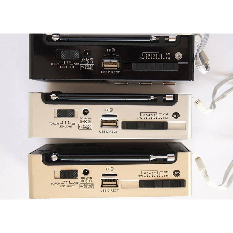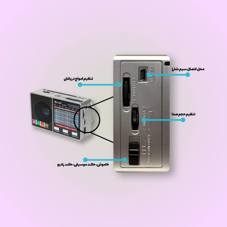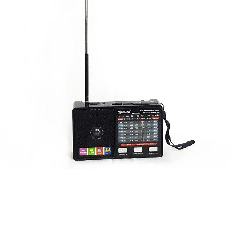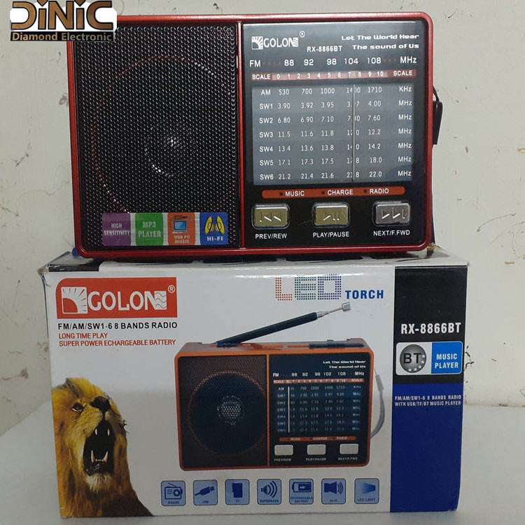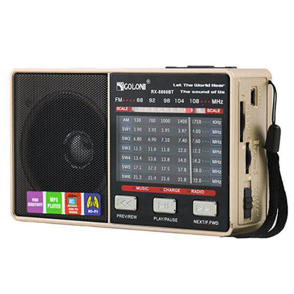 رادیو Golon RX-8866 از رادیو های کوچکی است که به خاطر ابعادش شما قادر به جابجایی راحت تر آن هم هستید. بندی که در گوشه ی آن قرار داده شده، شما را قادر به آسان تر جابجا کردن رادیو می کند. می توانید بند را دور مچ خود قرار دهید و رادیو را همراه خود داشته باشید. شاید این گونه از رادیو ها را بیشتر در مغازه ها و خانه های قدیمی دیده باشید که در حال پخش رادیو هستند. اما شما می توانید با استفاده از Golon 8866BT ، به غیر از گوش دادن به موج های رادیویی ، به موسیقی هم گوش دهید. این محصول دارای پورت های TF و USB می باشد که بدین ترتیب به شما امکان گوش دادن موسیقی را از Micro SD و فلش مموری می دهد. افزون بر پورت های نام برده شده، شما همچنین می توانید با اتصال بلوتوث دستگاه های مختلف خود مثل گوشی ، لپتاپ و…، به این رادیو ، از این طریق هم به گوش دادن موسیقی بپردازید. Golon RX-8866 توانایی پشتیبانی از موج های FM / AM / SW1-6 را دارد و با صفحه ی تنظیم موجی که که دارد شما را از موج و فرکانسی که استفاده می کنید، مطلع می سازد. برای دریافت قوی تر فرکانس ها، پشت این محصول آنتنی قرار داده شده است که به این روند کمک بیشتری می کند. در RX-8866 کلید های کنترل موسیقی و تنظیم رادیو ، در کنار و بالای بدنه قرار گرفته اند. همچنین کلیدی برای روشن و خاموش کردن چراغ قرار داده شده روی رادیو ، در بالای آن تعبیه شده تا در مواقع لزوم، از نور آن استفاده کنید. علاوه بر تأمین انرژی Golon RX-8866 از برق شهری، شما می توانید از دو نوع باتری BL-5C(نوکیایی) و باتری قلمی شارژی به طور جداگانه هم بهره ببرید و با کابل MiniUSB که در درون جعبه آن قرار داده شده است، به شارژ این باتری بپردازید.