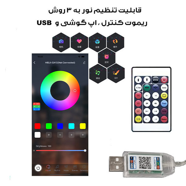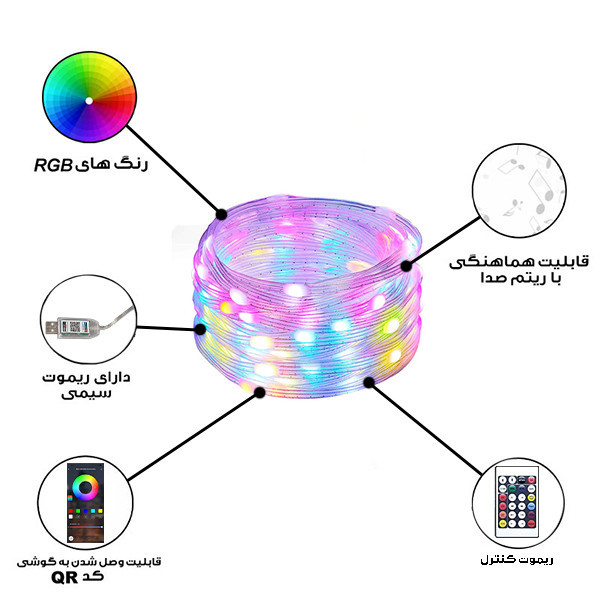دارای ریموت کنترل - دارای اپلیکیشن موبایل - قابلیت تنظیم رنگ و رقص نور در حالتهای مختلف