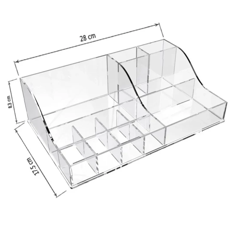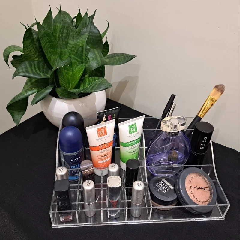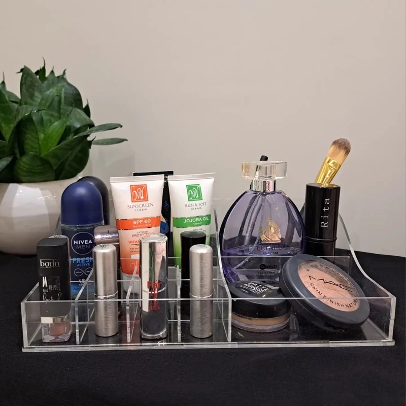 یکی از معضلات بانوان هنگام استفاده از میز آرایش بهم ریختگی و شلوغی میز می باشد.این عامل باعث می شود گاهی اوقات وسائل کوچک آرایشی گم شده یا پیدا کردن آنها زمان بر باشد.همچنین به استفاده ی بهینه از فضای میز آرایش کمک بسیاری میکند.این محصول به دلیل فضاهای زیادی که دارد به تفکیک چیدمان لوازم آرایشی (کرم،مداد،رژلب و..) کمک میکند.
