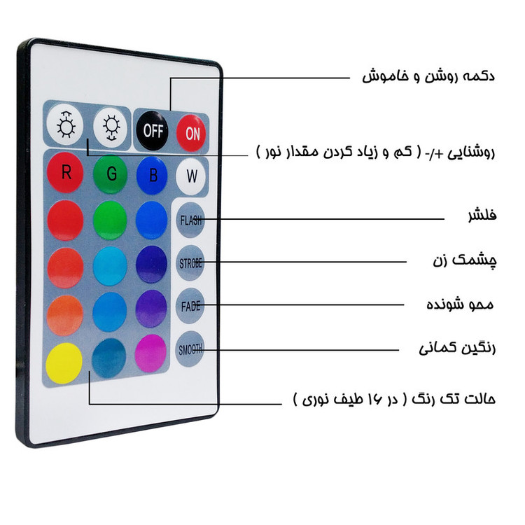 💡 نور ۱۶ رنگ با ریموت کنترل (دارای سه رنگ اصلی آبی قرمز سبز و ساخت بقیه رنگ ها از ترکیب این سه رنگ)